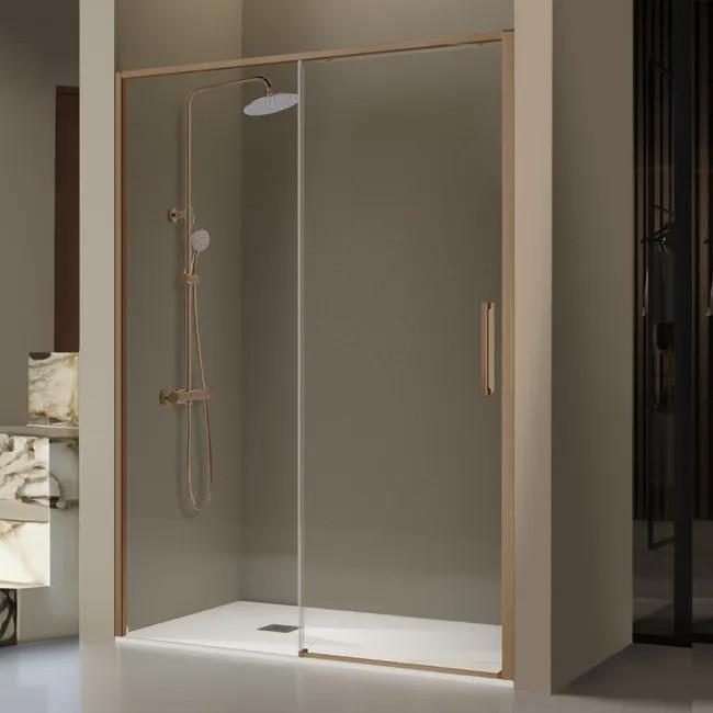 Mampara de ducha frontal DELTA DE102 corredera en color Gun Metal y Bronce cepillado, fabricante Kassandra, 1 fijo + 1 hoja corredera, esta mampara no lleva guías ni rodamientos inferiores, sin perfilería entre los cristales consiguiendo una sensacional estética, amplitud en el baño y limpieza. Guía superior minimalista de 2,2 cm