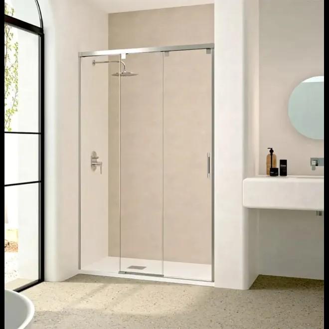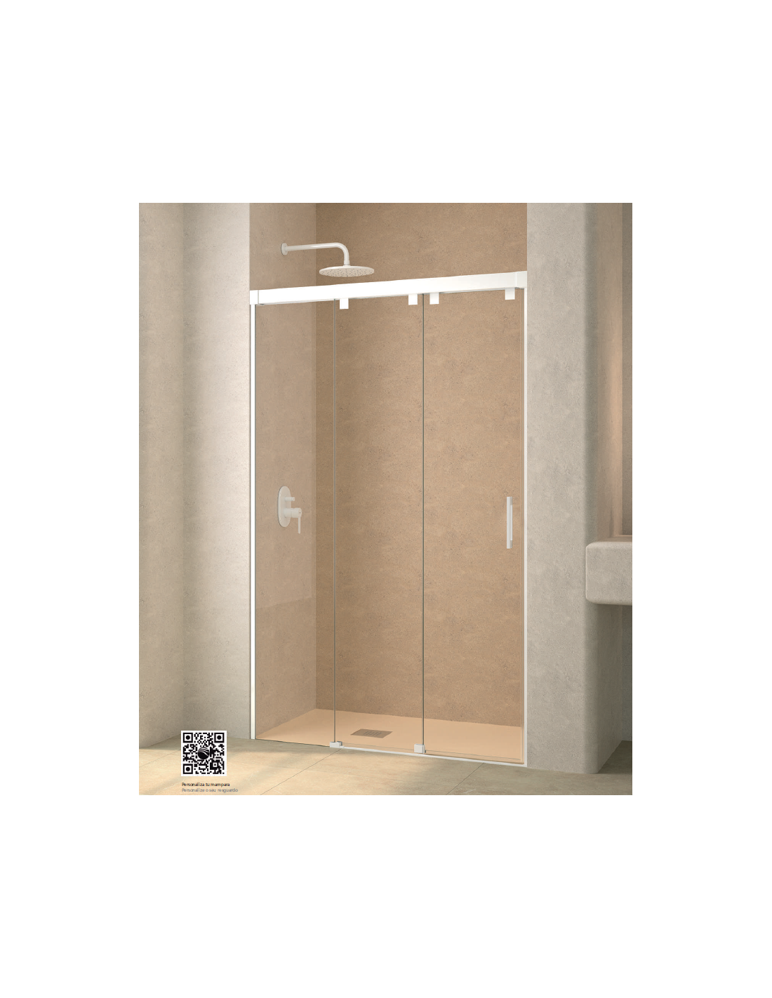 Mampara de ducha de 1 fijo + 2 hojas correderas sin guía inferior modelo MERIDA de Doccia Group le permite conseguir tener el máximo espacio de entrada. Mampara con un mini perfil base para garantizar su estanquidad y una mejor accesibilidad, sin perfilería entre los cristales consiguiendo una sensacional estética, amplitud en el baño y limpieza. Apertura y cierre con sistema de arrastre. MAXIMO ESPACIO DE ENTRADA.