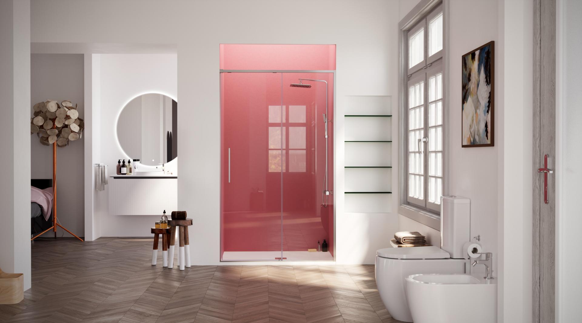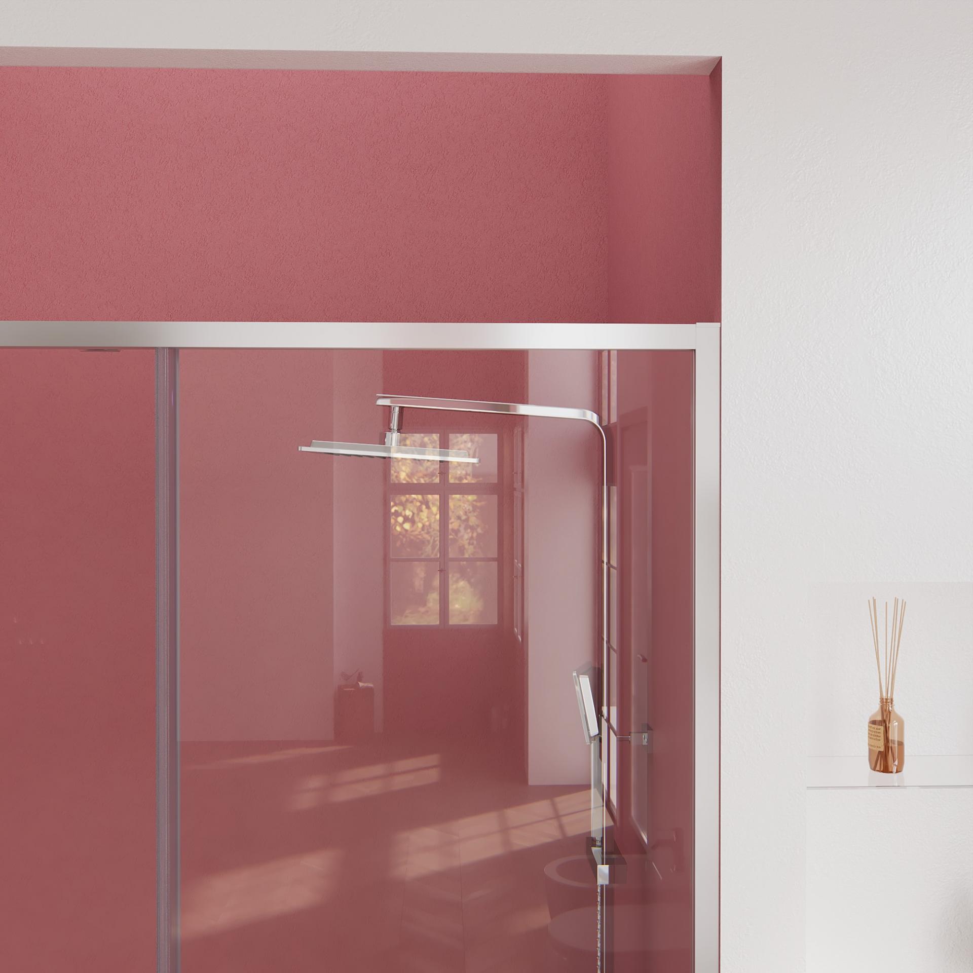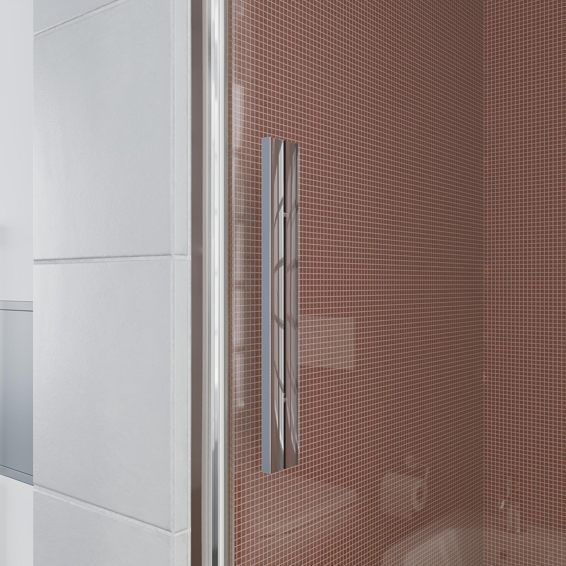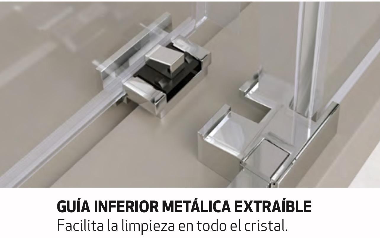Mampara ducha MINIMALISTA frontal fijo + corredera, guía superior de tan solo 2,5 cm, perfecta mampara para baños pequeños, poca perfilería, fabricada con los mejores acabados al mejor precio. Nuevo tirador exclusivo de 44 cm extraplano.