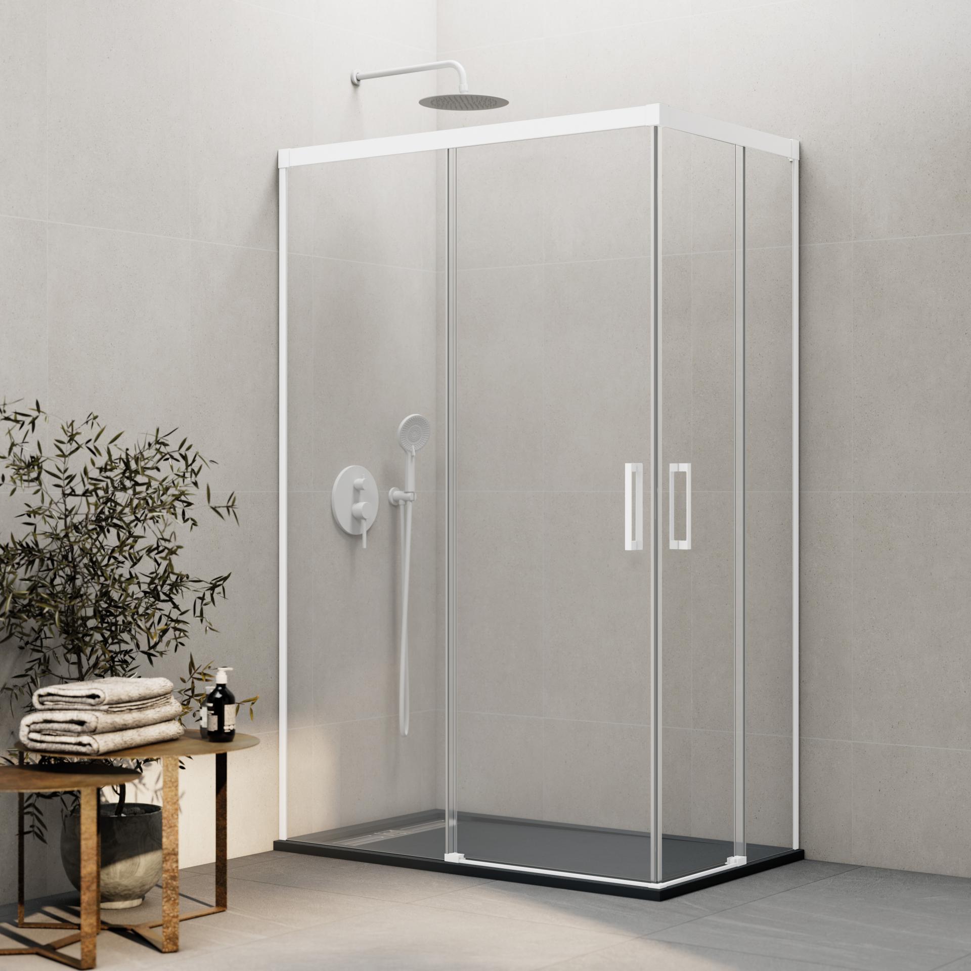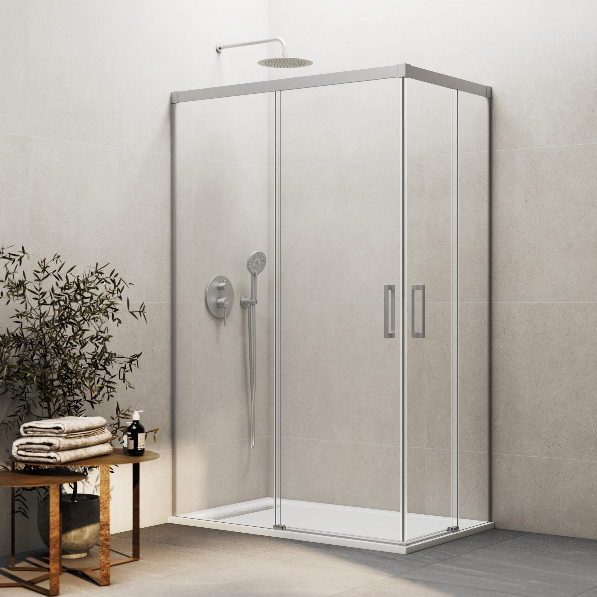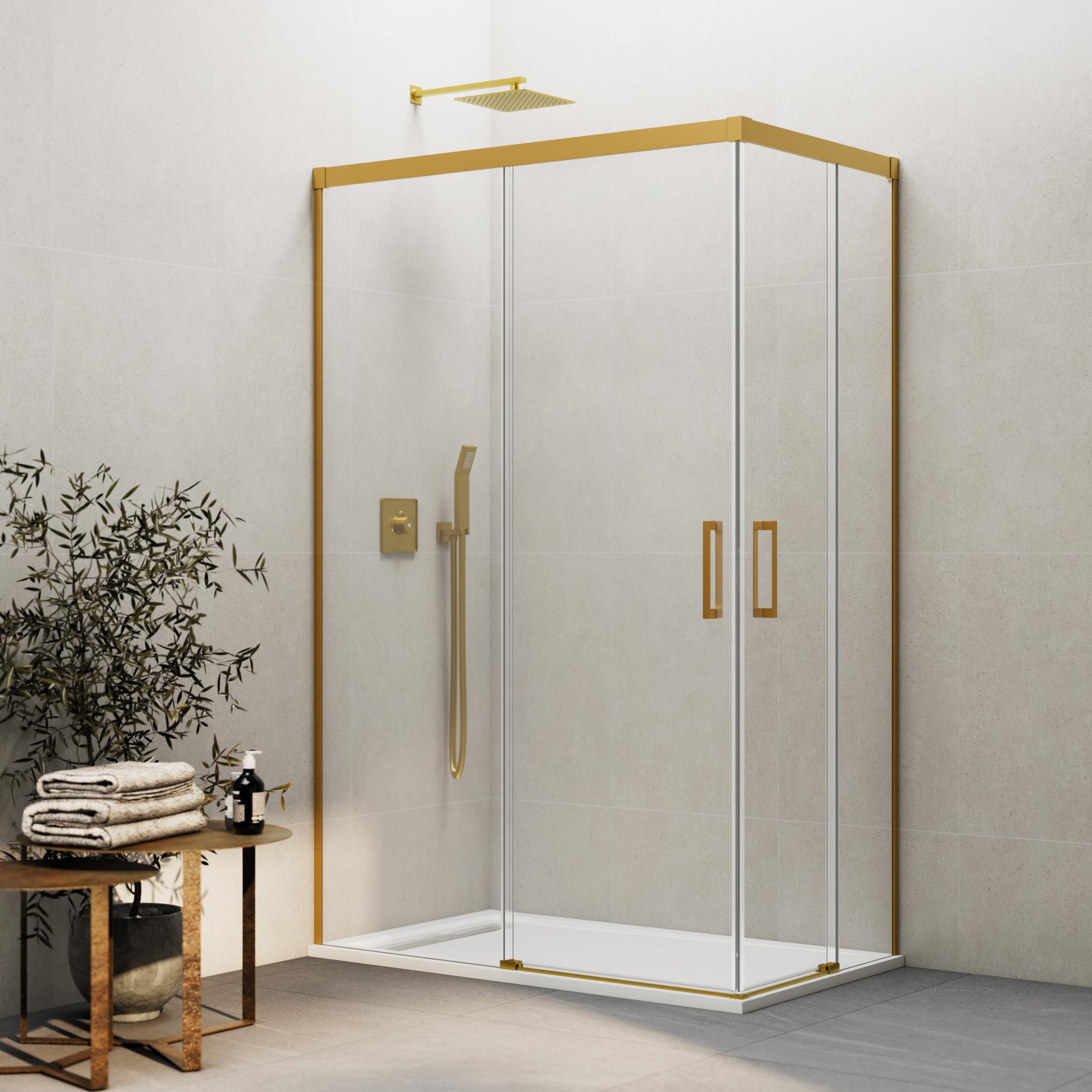Mampara ducha angular corredera disponible en cobre, níquel, oro, blanco y titanio, para platos cuadrados o rectangulares, apertura en vértice. Mampara para espacios reducidos o baños pequeños con poca perfilería y sin guías inferiores consiguiendo un perfecto mantenimiento y limpieza.
