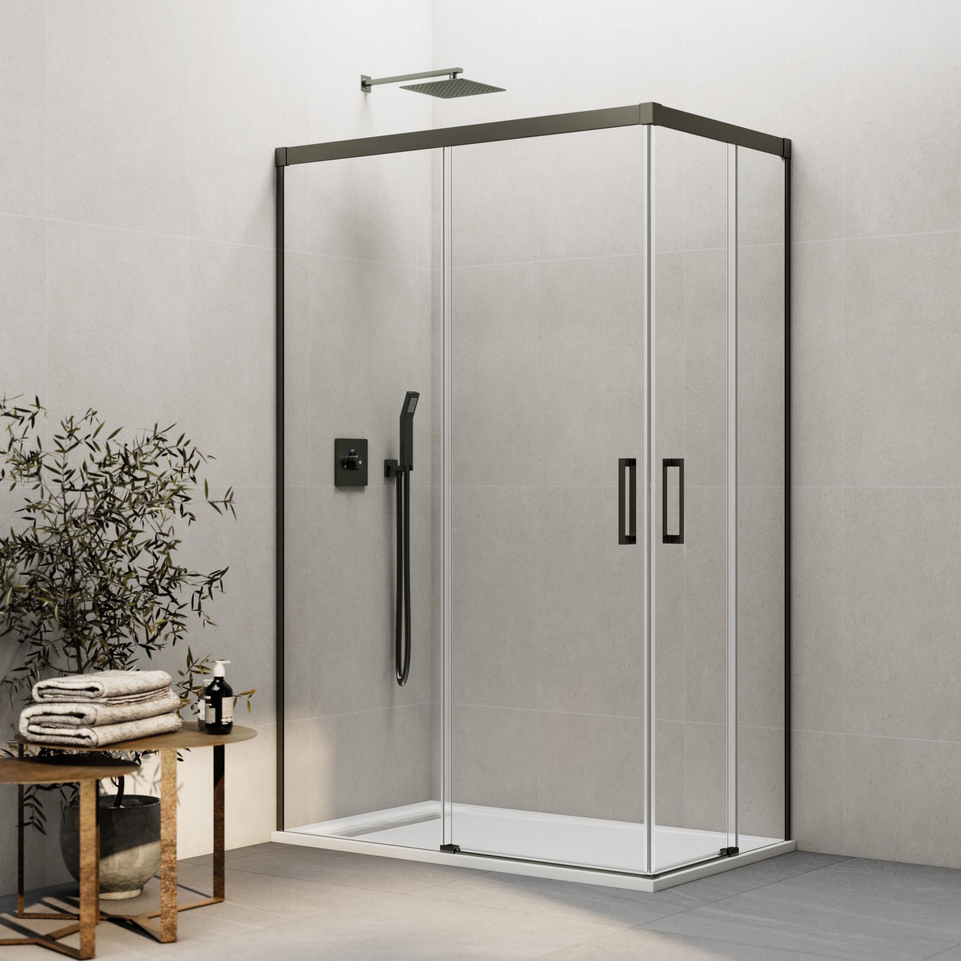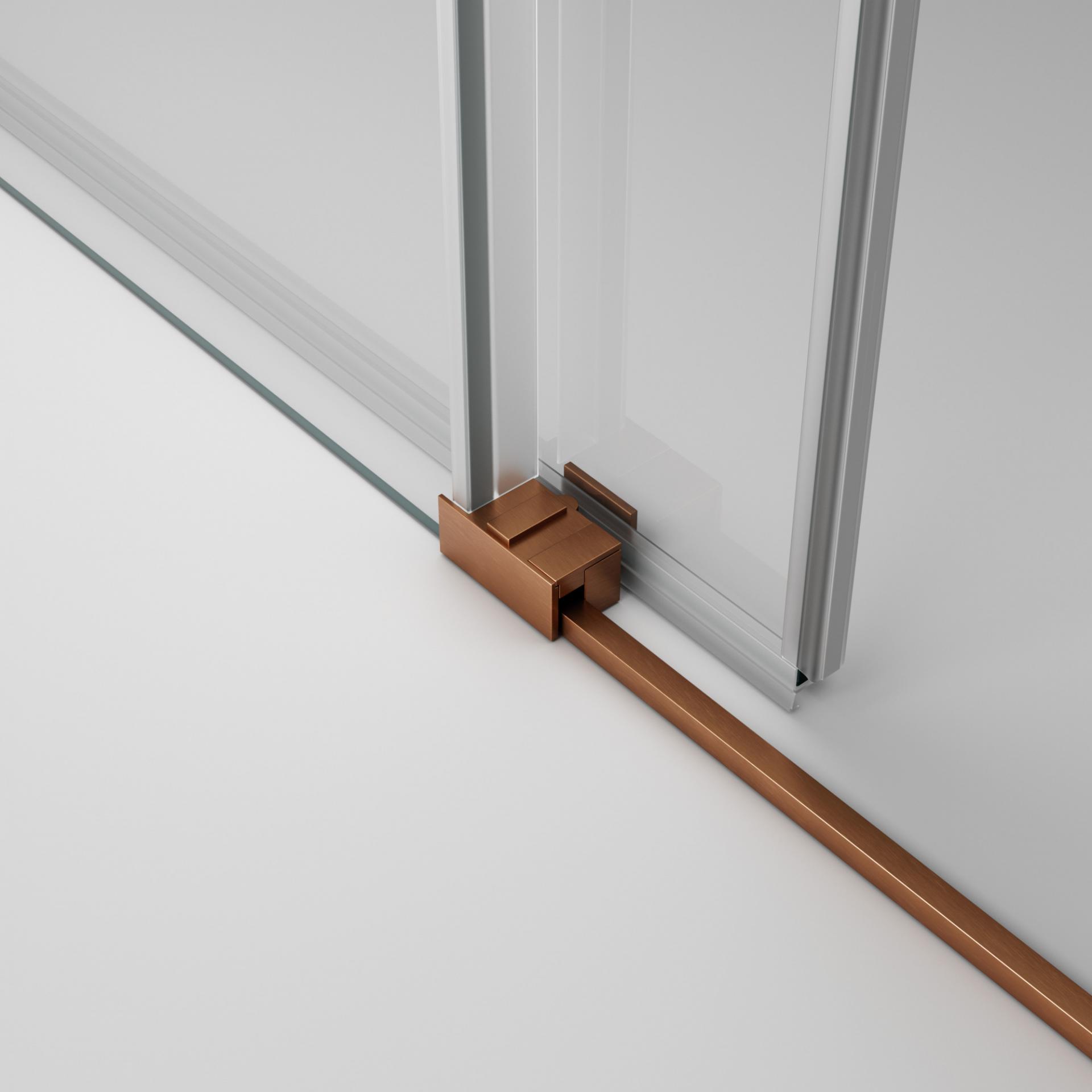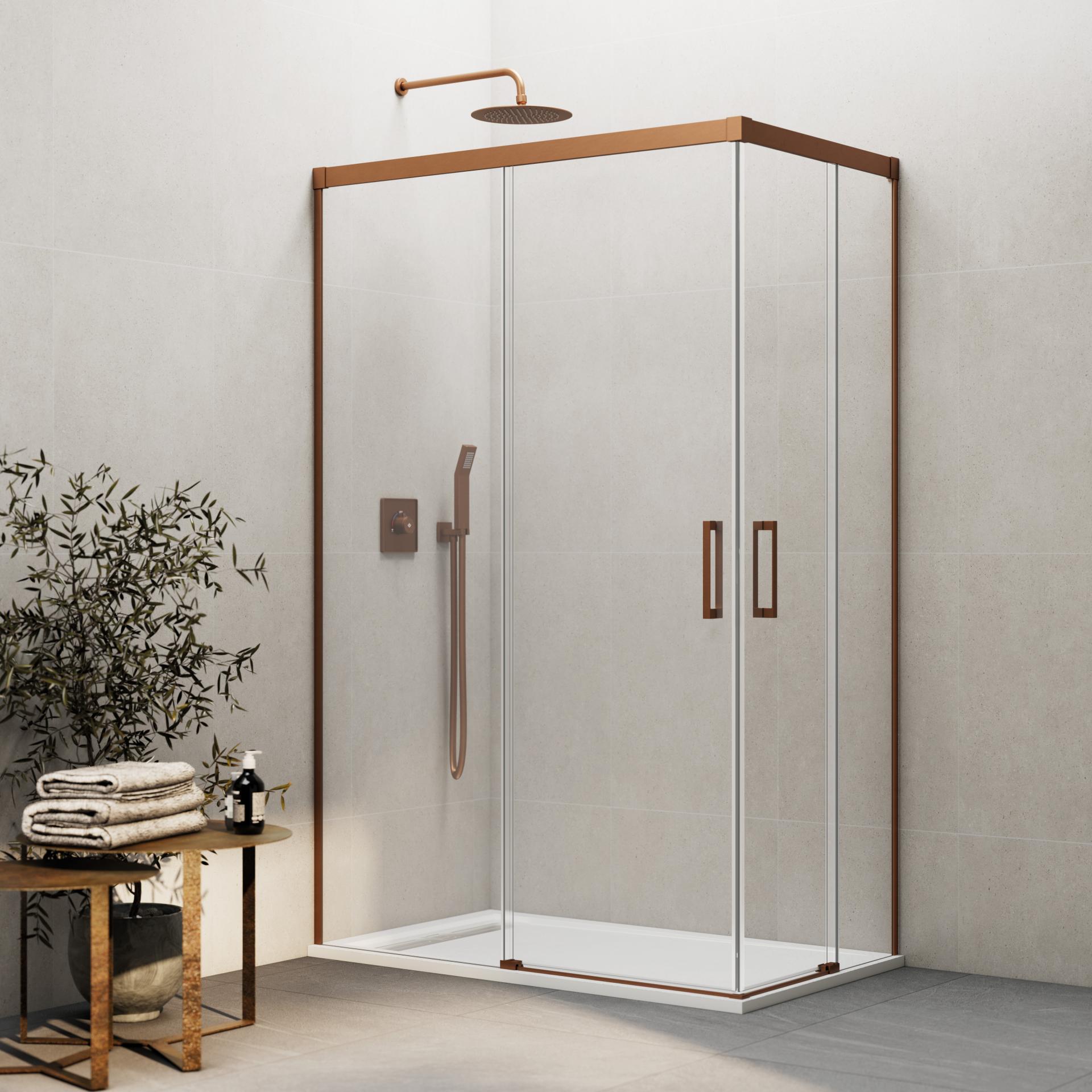 Mampara ducha angular corredera disponible en cobre, níquel, oro cepillado, blanco y titanio, para platos cuadrados o rectangulares, apertura en vértice. Mampara para espacios reducidos o baños pequeños con poca perfilería y sin guías inferiores consiguiendo un perfecto mantenimiento y limpieza.