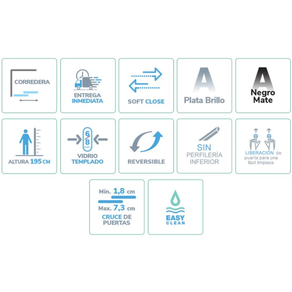 Composición: Fijo + corredera sin guías inferiores + lateral fijo. Posicionamiento reversible.